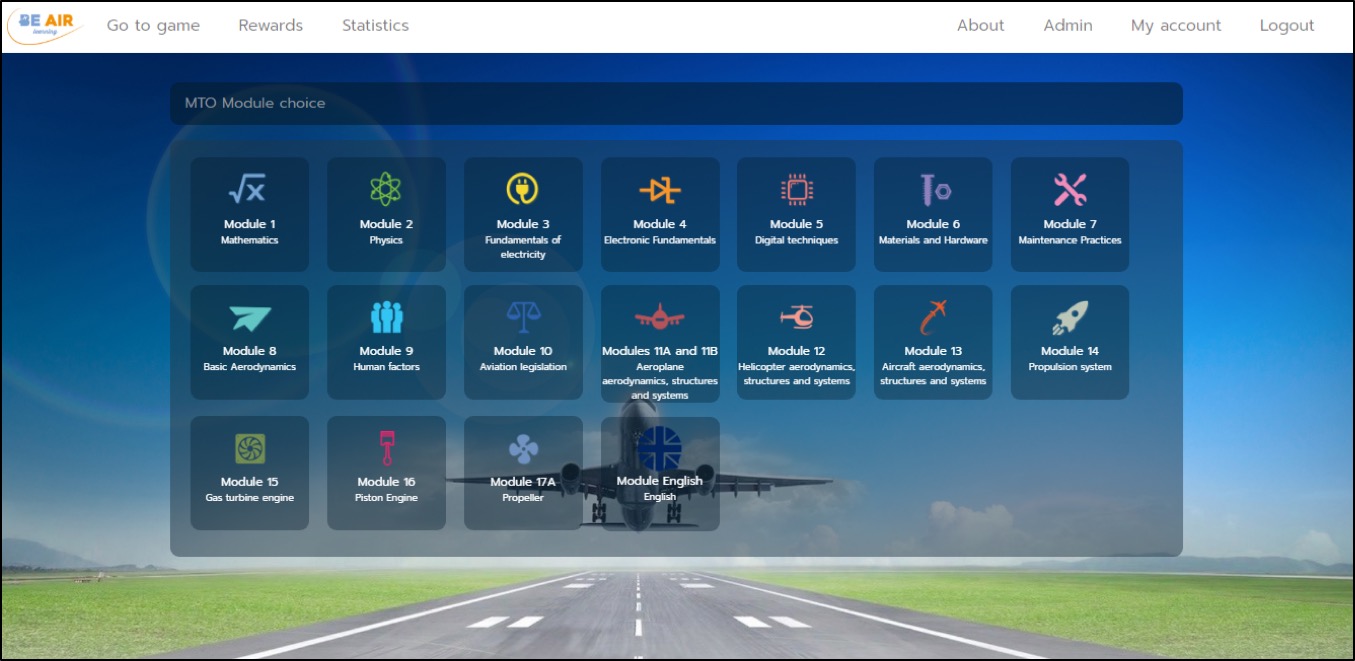 This tool can be used for training and revision purposes before sitting for an exam: the user can choose the module and then he or she can either train or test himself/herself. He/she can visualize his/her progress and performance on the game since the beginning and for each module (statistics menu). He/she can also study or revise the lessons with unlocked revisions cards.