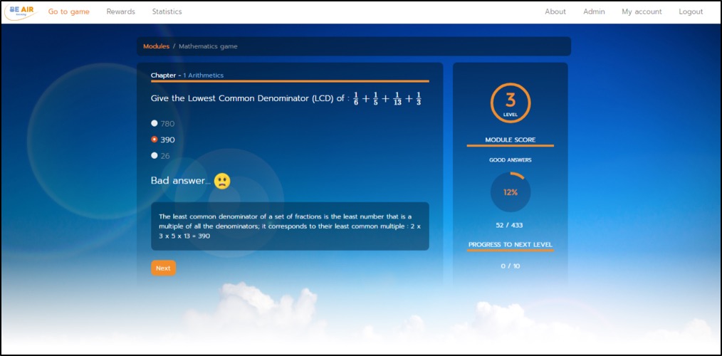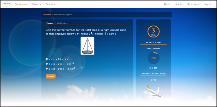 Statistics menu: The progress within each module is recorded and the percentage of “number of right answers”/ ”total number of answers” is given in “Statistics”. The percentage of the overall progress (“total of right answers since the beginning of the game”/ ”total number of answers already entered”) for all modules already studied is also given in the statistics menu. The overall level in terms of number of unlocked tiles and revision cards is also displayed in the rewards menu.