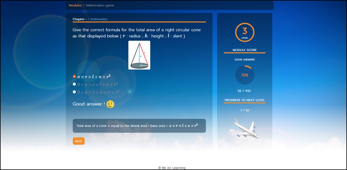 Each correct answer provides the student with a “part” of an airplane (image on the bottom left-hand side of the picture).